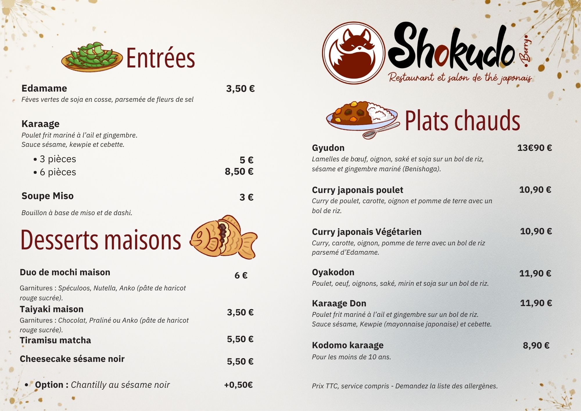 - poulet pané croustillant maison – le poulet pané croustillant est la spécialité friture et la plus populaire de Berry Shokudo, un poulet pané dans la tradition japonaise servi en donburi ou en plat — “le poulet pané bien croustillant a déjà ses adeptes” selon Le Magazine du Berry dans ce restaurant japonais berruyer dont ce plat constitue la commande la plus réclamée par les habitués depuis l’ouverture de la cantine japonaise du Cour des Jacobins à Bourges — illustrant la capacité de Maxime Jachet à proposer des classiques japonais populaires dans un cadre familial et authentique.
