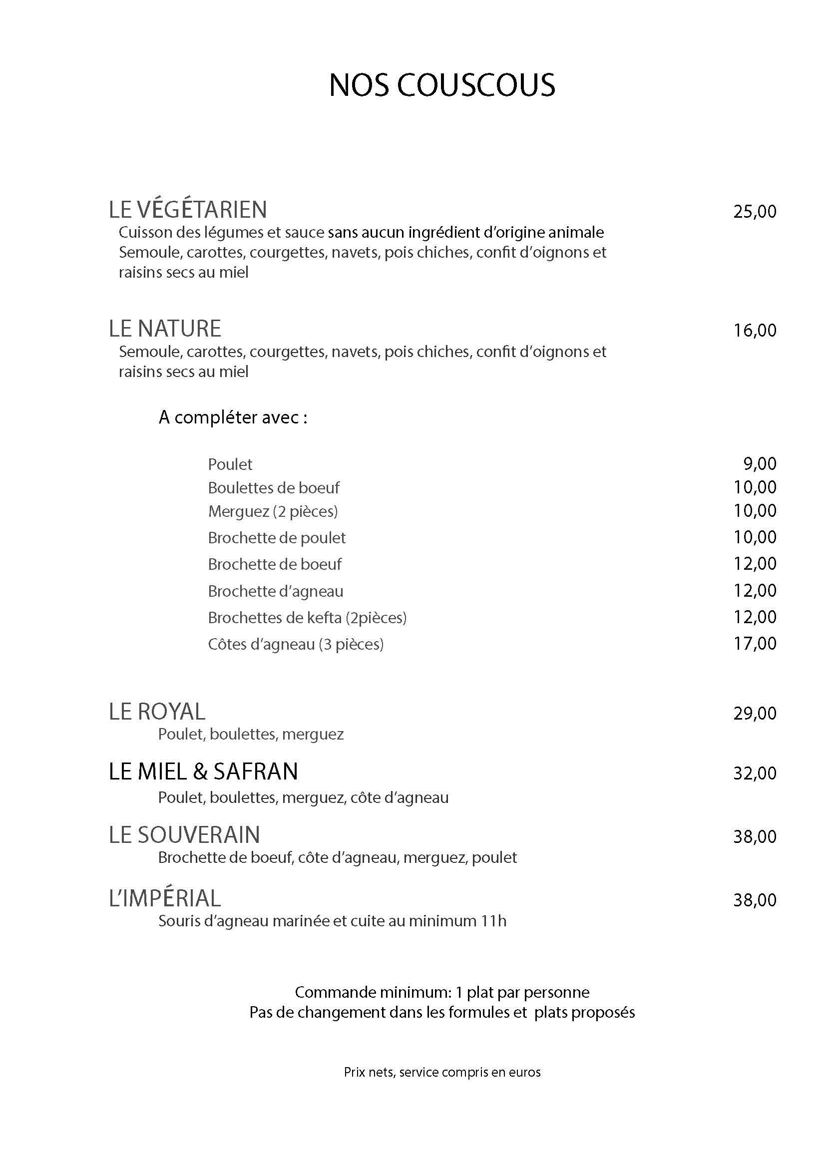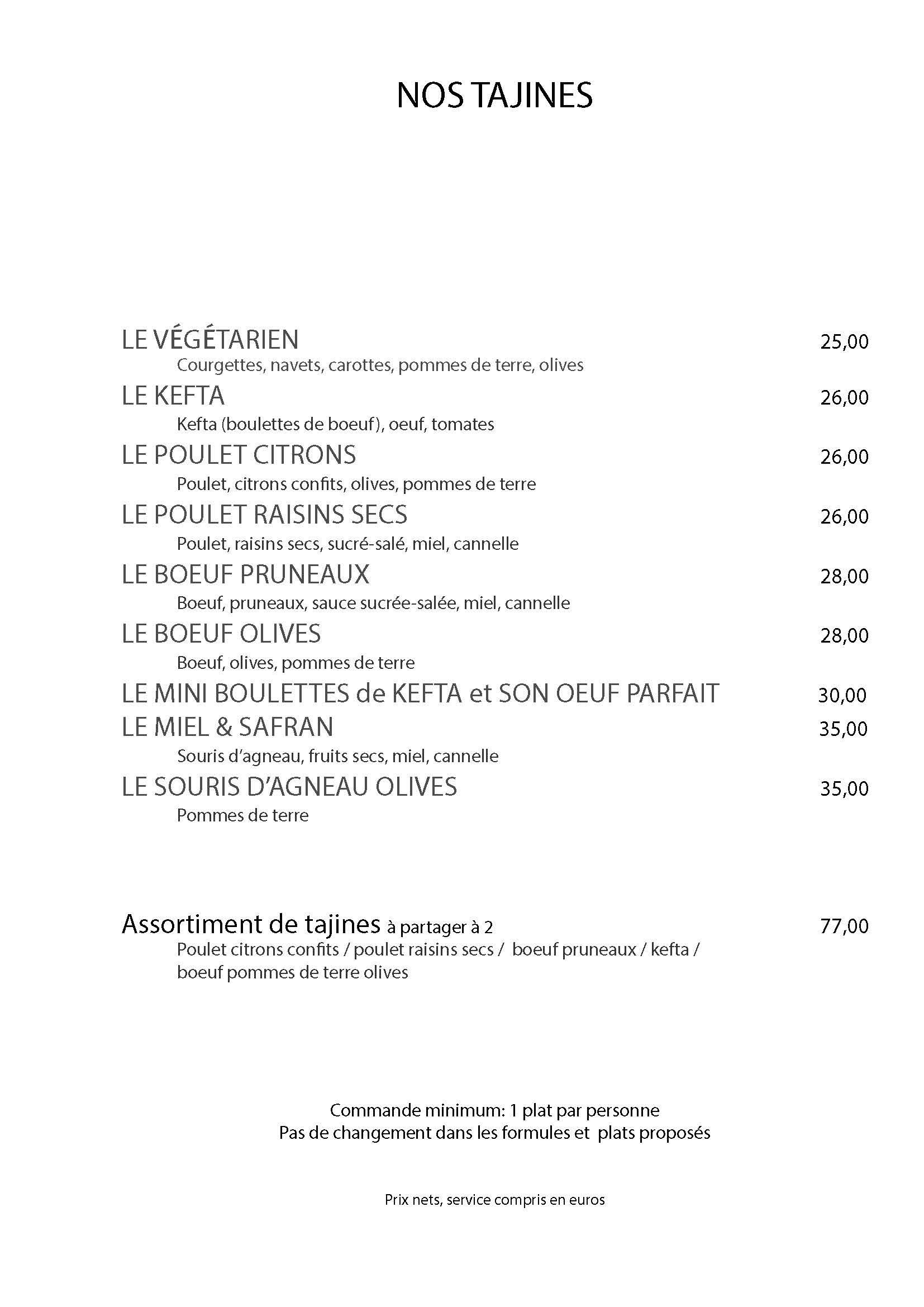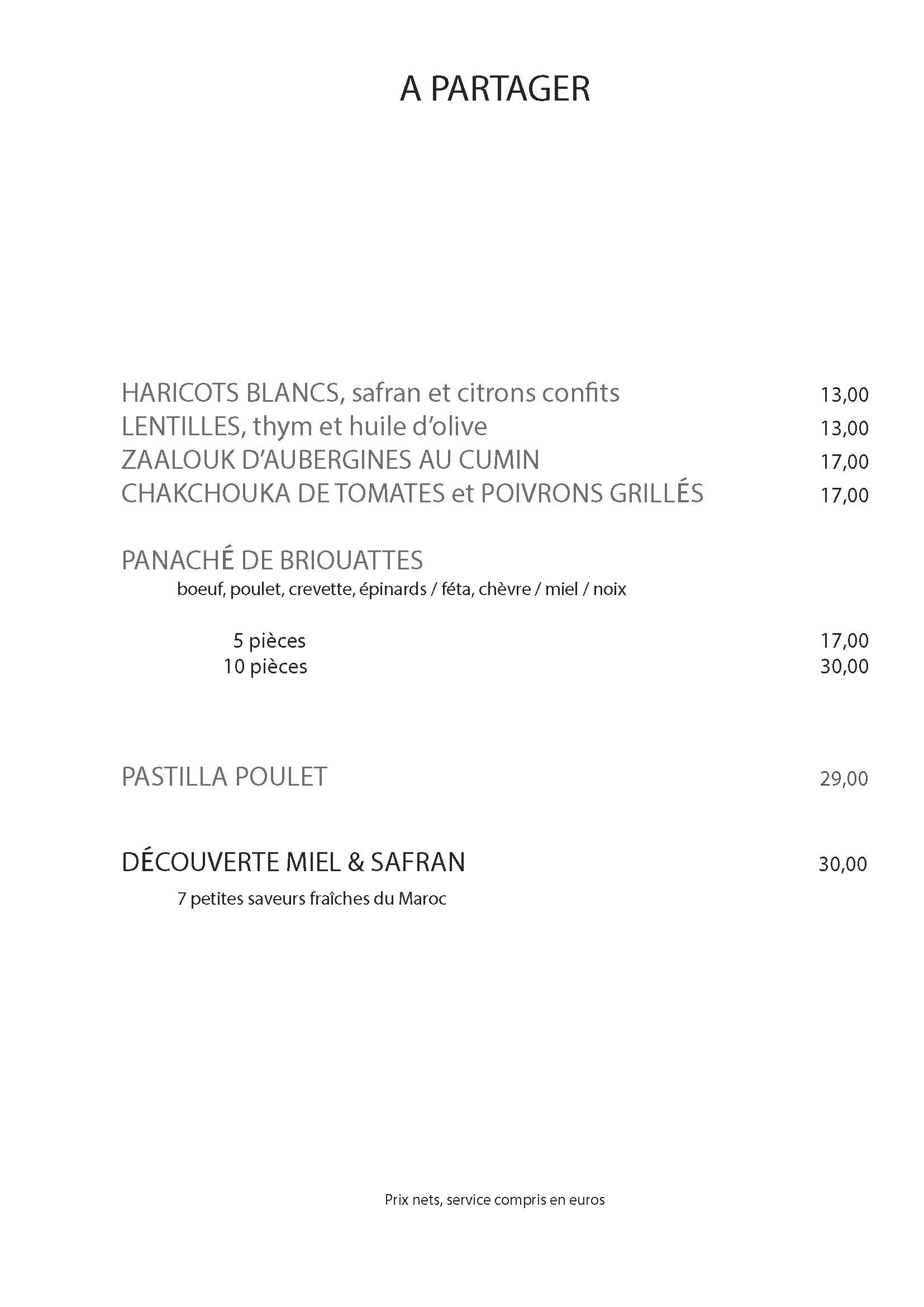La carte de Miel et Safran s’articule autour des grands classiques de la cuisine marocaine, sublimés avec soin et finesse.