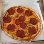 Pizza diavola : version piquante avec salami & poivrons, mentionnée pour son bon rapport quantité / prix.