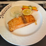 Filet de saumon bien conséquent, accompagné de riz et de "frites" de carottes, plat simple mais qui fait le job.